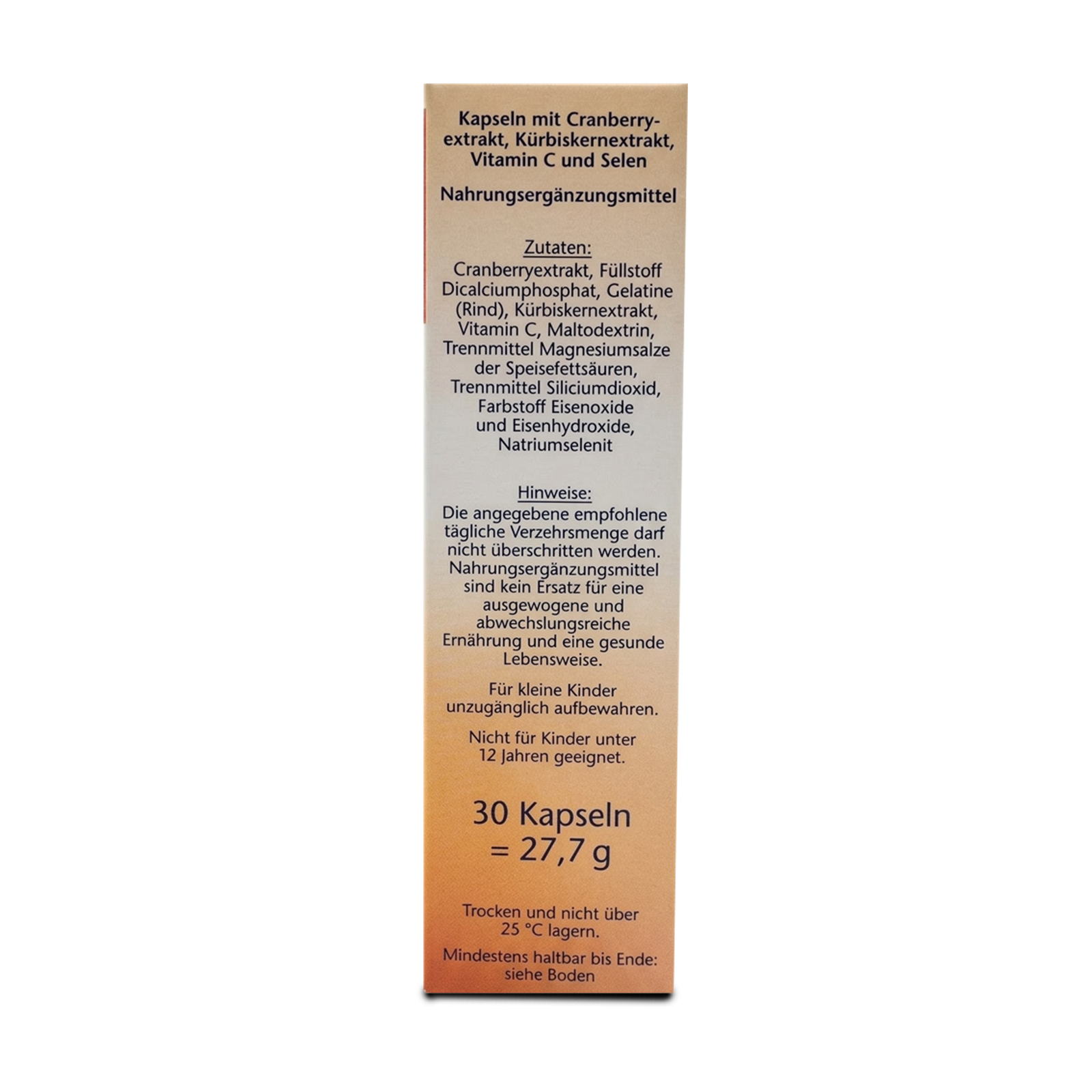 - Cranberry extract, bulking agent dicalcium phosphate, gelatin (bovine), pumpkin seed extract, L-ascorbic acid, maltodextrin, anti-caking agent magnesium salts of fatty acids, anti-caking agent silicon dioxide, color iron oxides & iron hydroxides, sodium selenite.